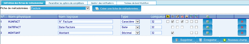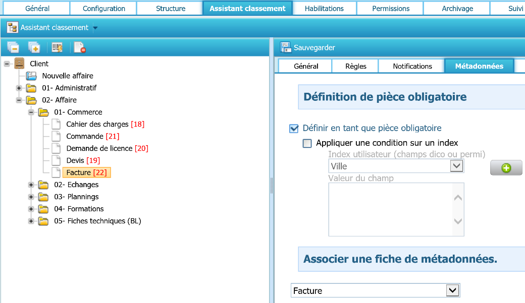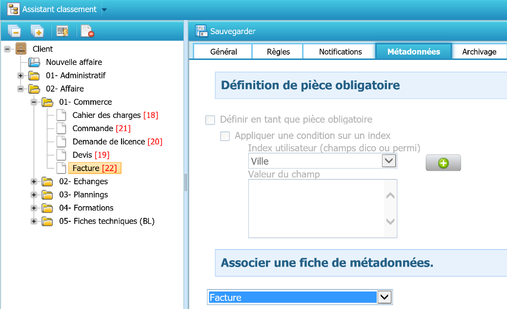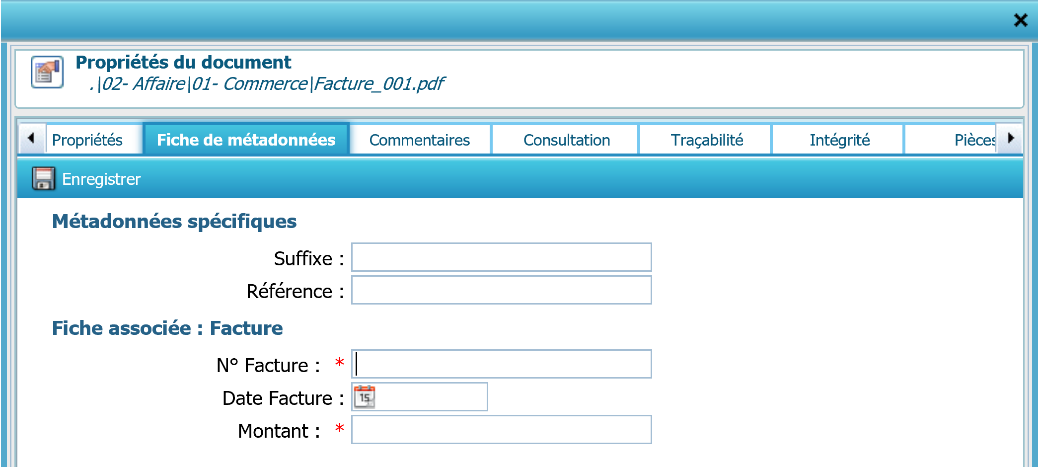 Cette fonctionnalité permet de définir des métadonnées à chaque document et par conséquent facilite sa recherche et son traitement ultérieur. Dans une même armoire en mode fichier, les documents peuvent avoir des métadonnées distinctes.