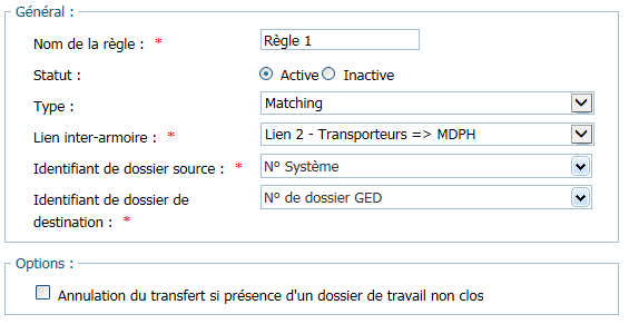 Type : Matching (les dossiers sont transférés si trouvés dans les deux armoires) ou création (si matching impossible)