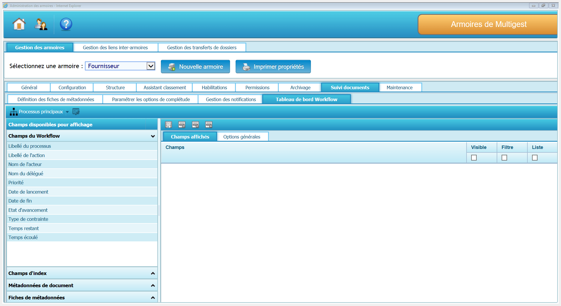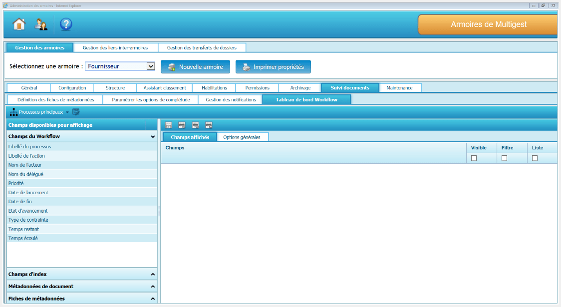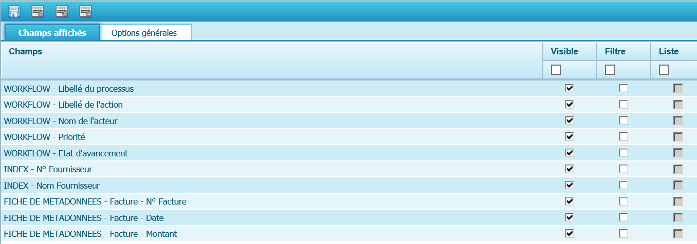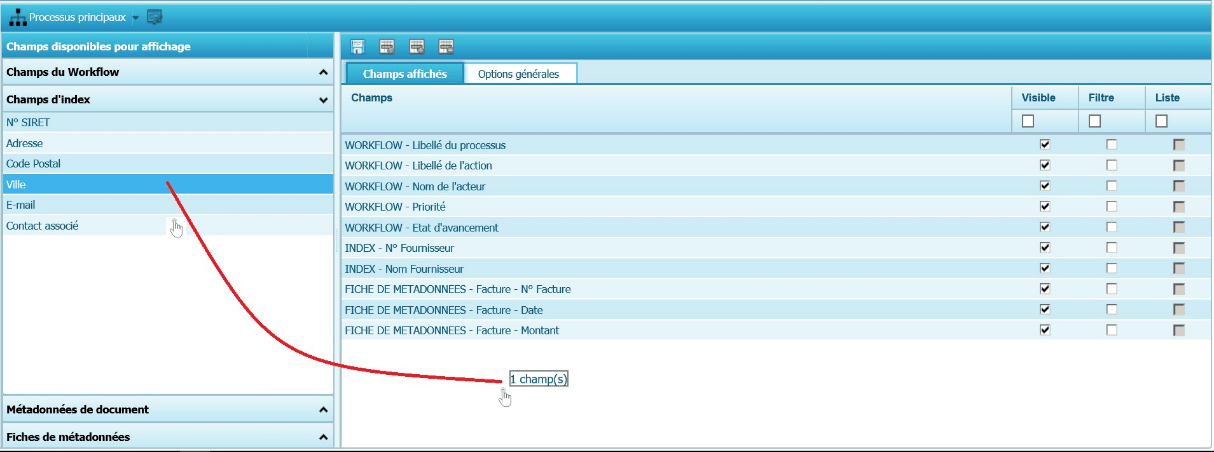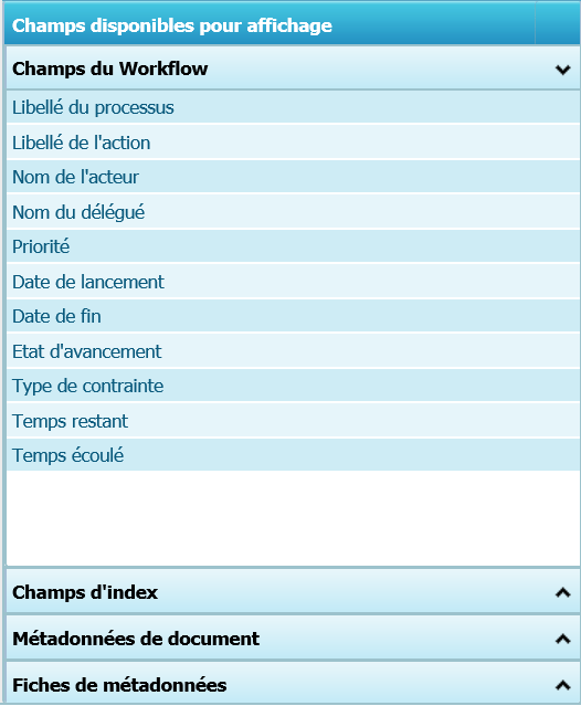 Champs disponibles pour affichage : Liste des champs qu’il est possible d’afficher parmi les index, le workflow et les métadonnées