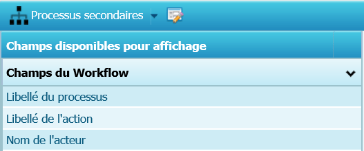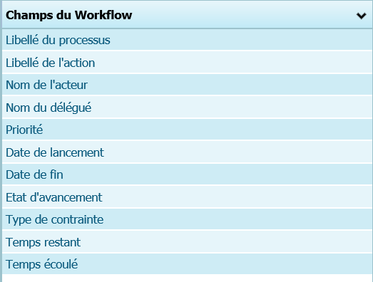 Champs du Workflow : Il s’agit des champs spécifiques au processus du Workflow (libellé du processus, libellé de l’action, …)