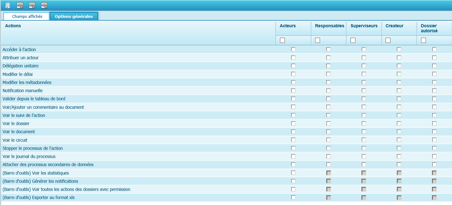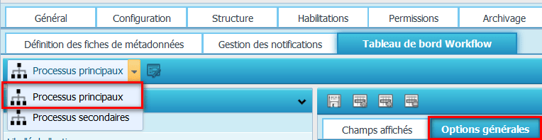 Options générales : Permet de sélectionner les actions disponibles pour l’acteur du processus dans l’affichage du tableau de bord
