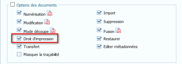 Pour que l’export et la fusion des documents puissent se faire, le droit d’imprimer doit être actif pour chaque élément du Plan de Classement correspondant aux documents à fusionner dans le tableau de bord.