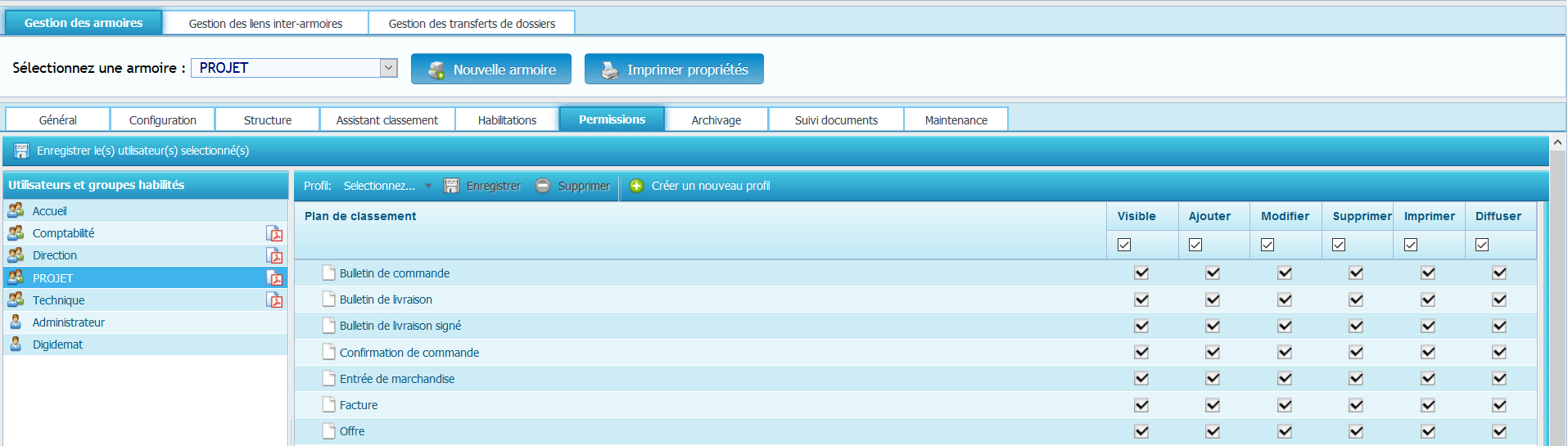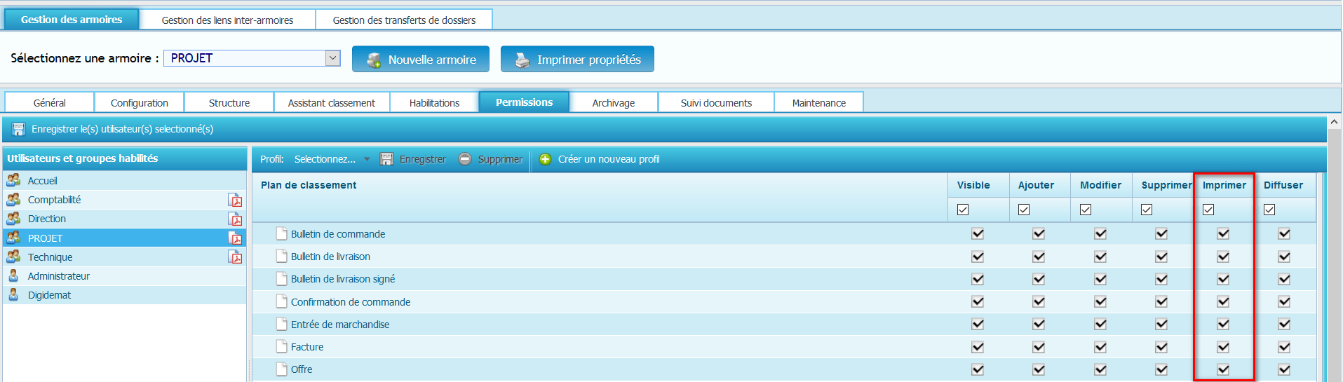 La vérification ou modification de ces droits se configure dans l’onglet « Permissions » de l’administration de l’armoire. Il est nécessaire vérifier au préalable que les utilisateurs aient l’habilitation pour imprimer dans l’armoire.