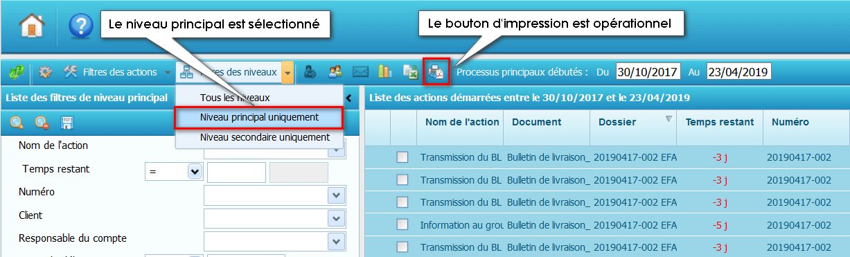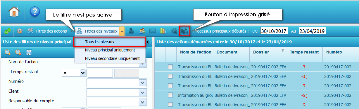 (Barre d’outils) Exporter au format XLS ou CSV : Permet d’exporter les listes des tâches Workflow au formet XLS ou CSV (Attention, il faut sélectionner le « Filtre des niveaux » à niveau principal uniquement)