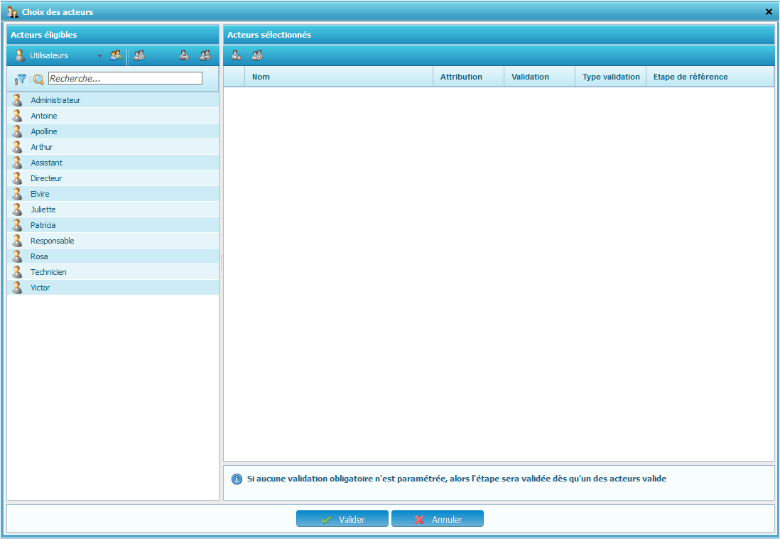 L’utilisateur peut ensuite sélectionner par « Glisser-Déposer » les acteurs à attribuer la tâche.