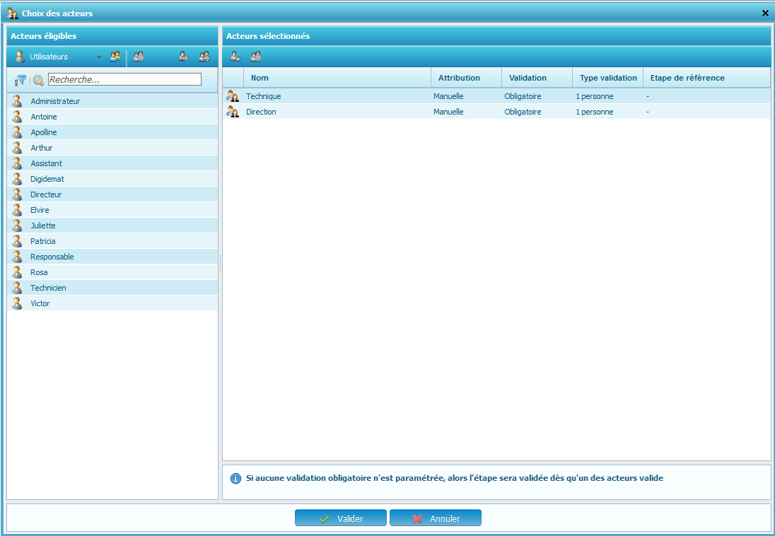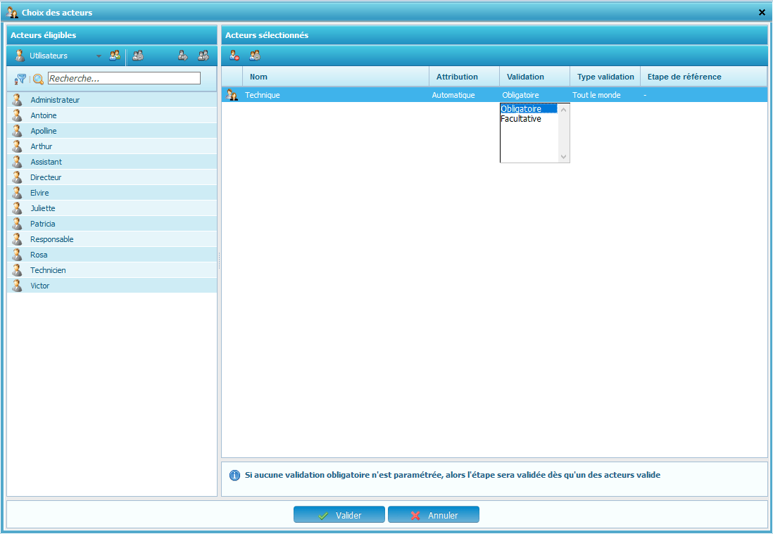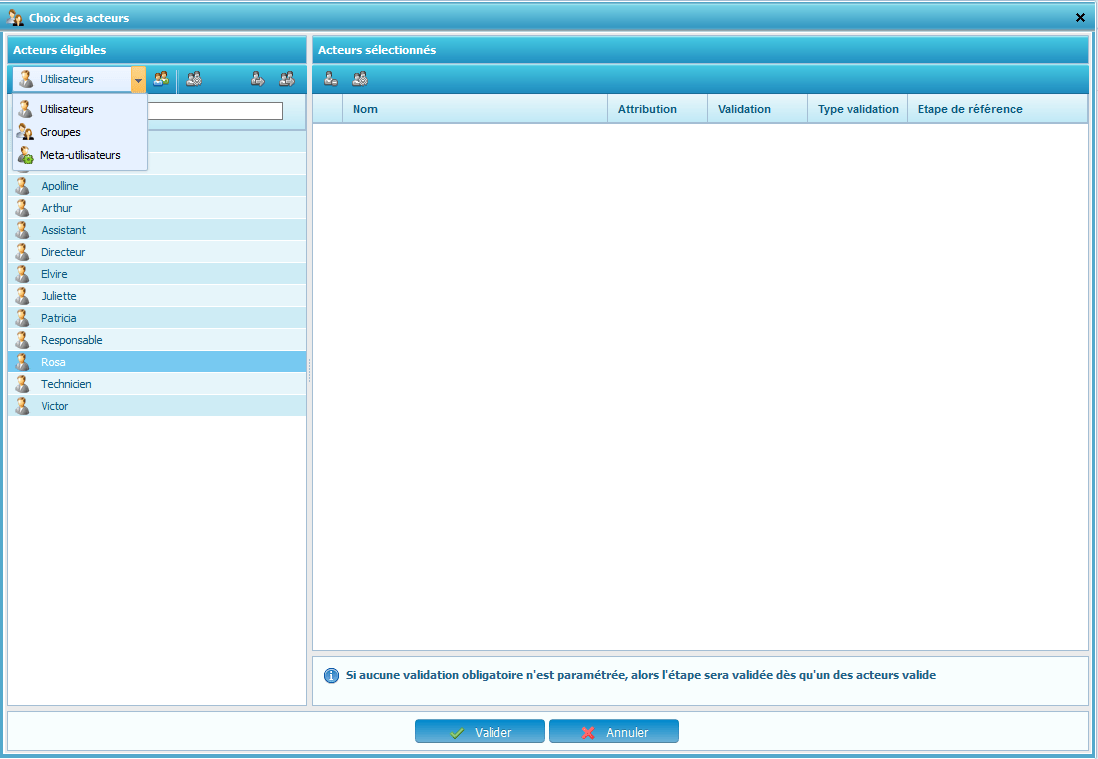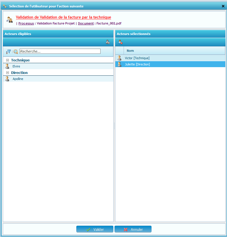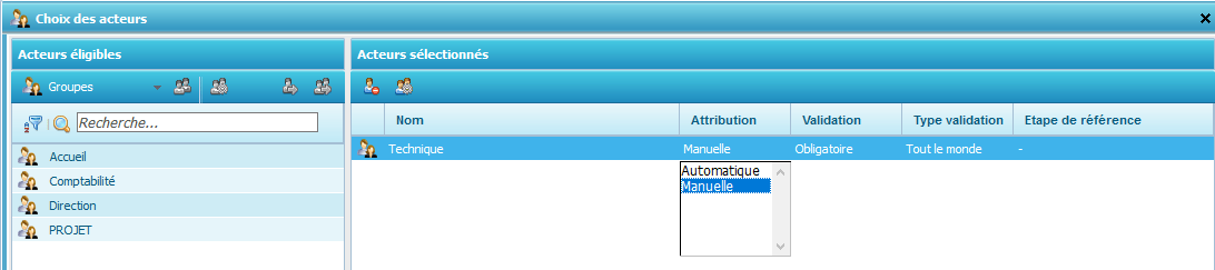 Lors du lancement du processus l’utilisateur a la possibilité de sélectionner des acteurs des groupes paramétrés.