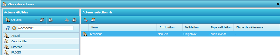 Sélectionner le(s) groupe(s) à définir dans l’attribution de la tâche du Workflow et le glisser dans la fenêtre des « Acteurs sélectionnés ».