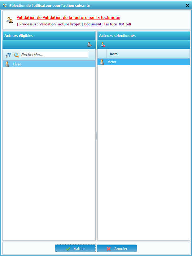 Une fenêtre d’attribution des tâches est proposée contenant les acteurs du groupe défini dans le paramétrage du processus.