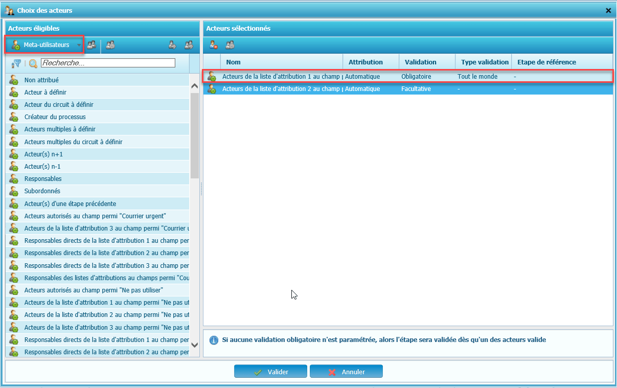 Lorsque on conçoit un Worfkflow il ressort parfois le besoin d’attribuer des actions à des acteurs qui répondent plus à une caractéristique commune qu’à l’appartenance à un groupe d’utilisateurs ou à une structure organisationnelle. Ce type d’utilisateurs nommés méta-acteur peuvent être sélectionnés à partir de la liste d’utilisateurs ou à partir d’une liste définie dans les permissions de l’armoire.