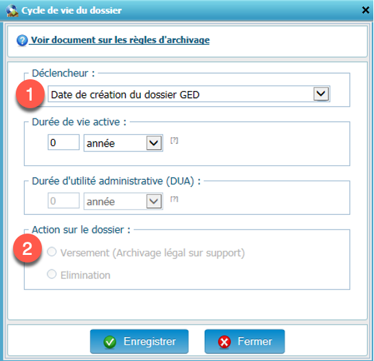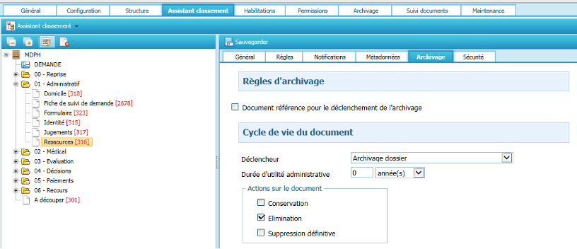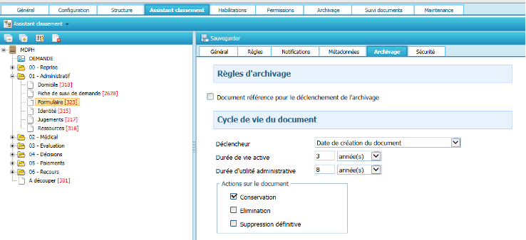 La gestion du cycle de vie des documents s’effectue à partir de l’interface de gestion du plan de classement. Pour chaque document défini dans le plan de classement il est possible de définir un cycle de vie approprié. Le cycle de vie défini tient en effet compte du sort final.