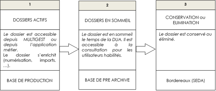 Ce cycle de vie permet de définir deux bases de stockage différentes (une base active et une base de pré-archive). La base active (la plus utilisée) est ainsi libérée des informations obsolètes et offre de meilleures performances d’interrogation et de lisibilité.