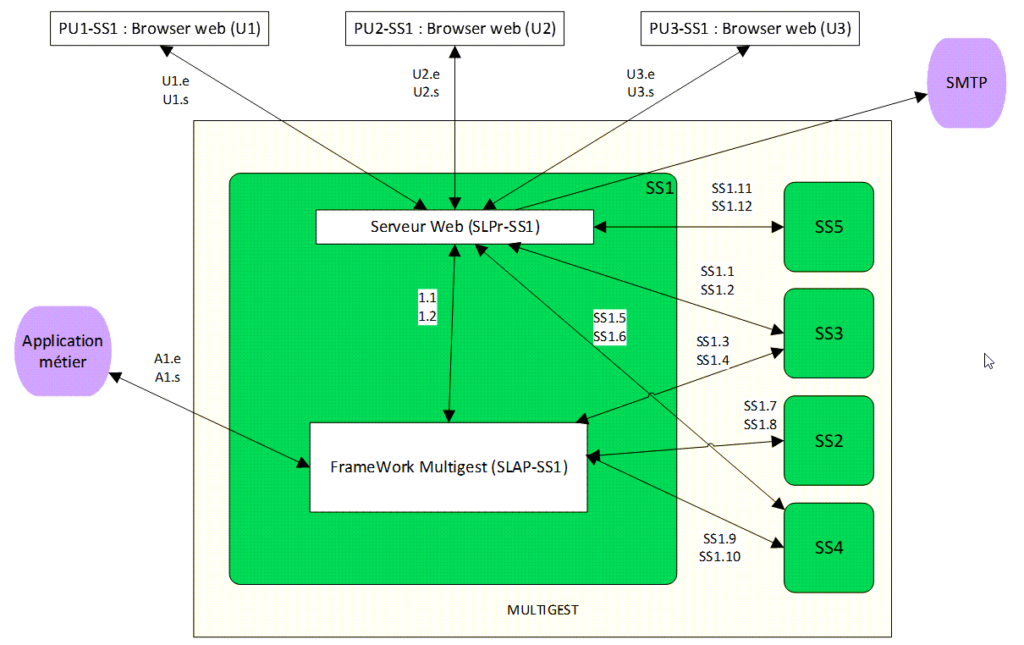 Les flux « SS4.3 » et « SS4.4 » correspondent aux échanges entre le PHP Multigest ainsi que le framework et le système de fichiers.