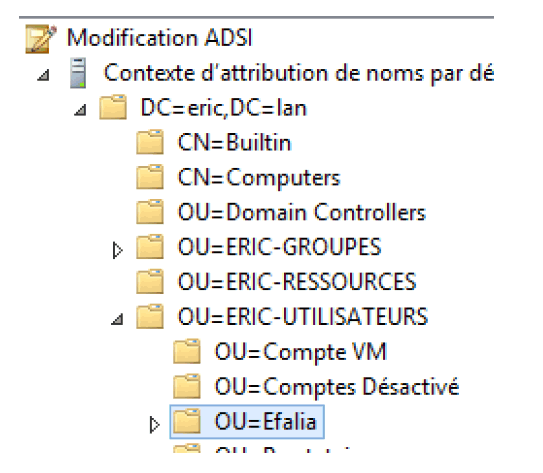 Pour connaitre le chemin de l’unité d’organisation (distinguishedName), vous pouvez aller sur le serveur active directory et ouvrir adsiedit.msc (modification ADSI) et aller sur le groupe où sont classés les utilisateurs.