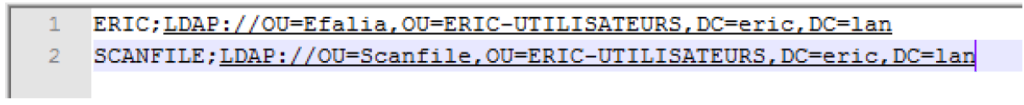 Ce fichier contient l’ensemble des chemins LDAP permettant l’accès aux utilisateurs dans l’AD. Chaque chemin permet d’accéder à des unités d’organisation différentes dans l’active directory.