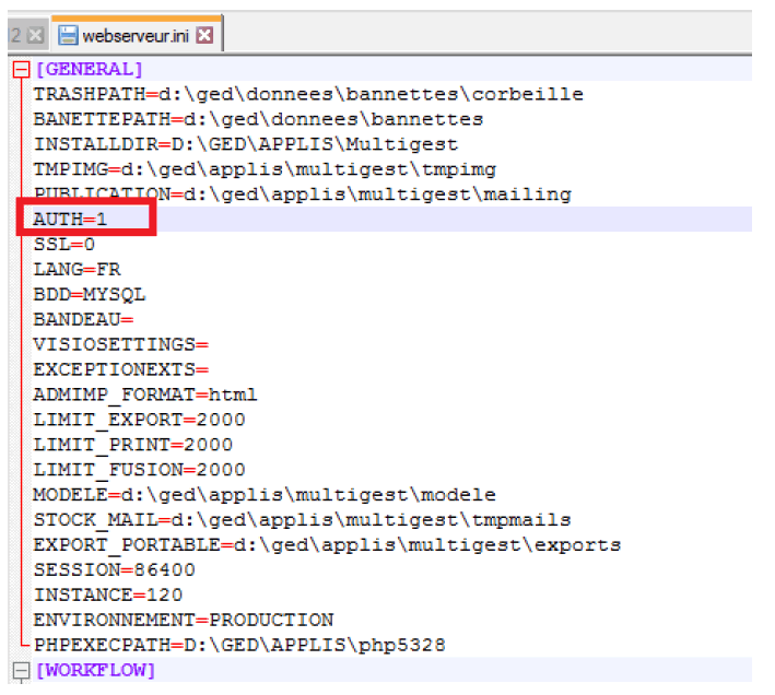 Pour activer la connexion automatique, il faut paramétrer le fichier webserveur.ini se trouvant sur le serveur de MultiGest dans le répertoire [INSTALL_MULTIGEST]/bin.