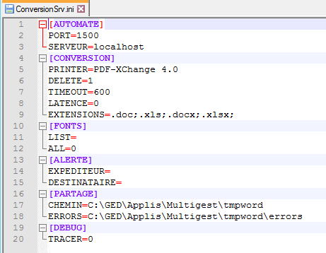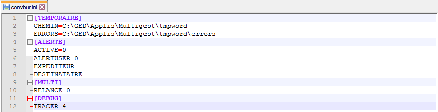 - Dans le répertoire « convbur » (dans le répertoire d’installation de MultiGest), ouvrir le fichier « conversionsrv.ini » avec un éditeur de texte.