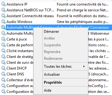 - Cliquer avec le bouton droit de la souris sur le service « Automate MultiGest Conversion » et sélectionner « Propriétés ».