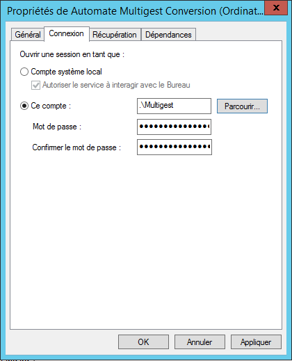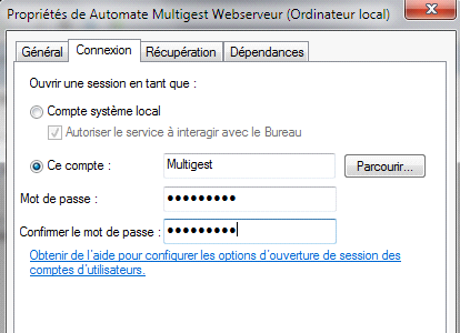 Ce service est lancé avec un compte système local automatiquement après l’installation de MultiGest.