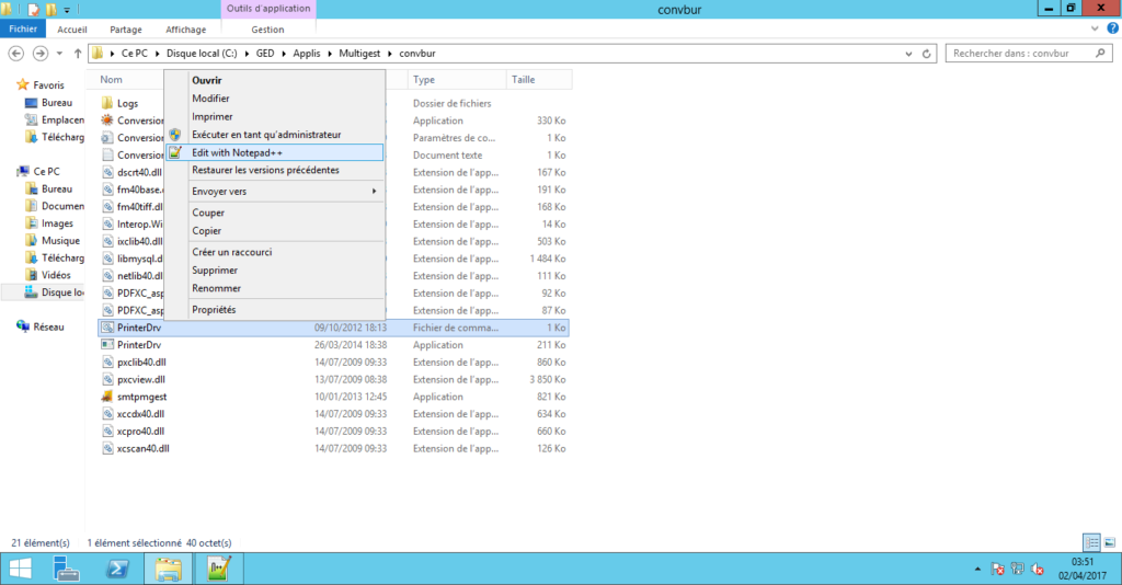 - Dans le répertoire « Convbur », ouvrir le fichier « PrinterDrv.bat »avec un éditeur de texte.