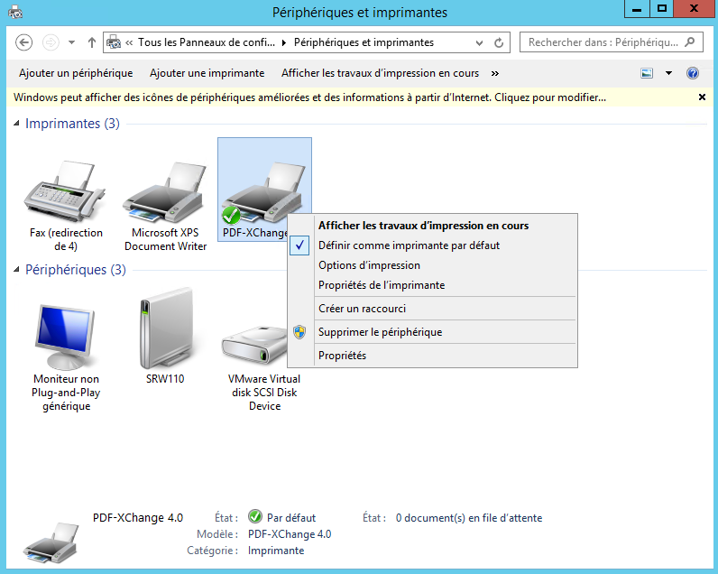 - Cliquer avec le bouton droit de la souris sur l’imprimante virtuelle, choisir « Propriétés de l’imprimante ».