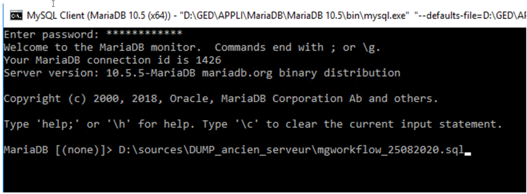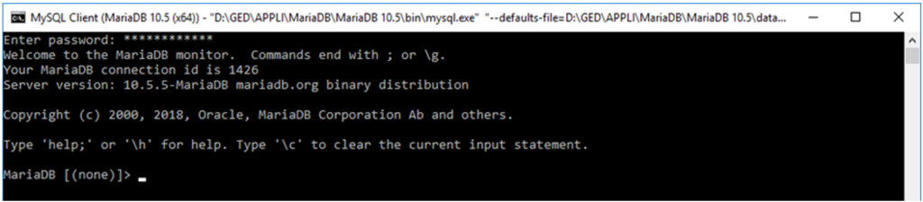 cd /D « INSTALLDIR _MYSQL\bin » Ou cd /D « INSTALLDIR _MARIA_DB\bin »