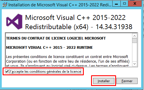 - L’installation proposera d’installer ou de réinstaller les Redistribuables (versions 32 bits et 64 bits) nécessaires au package. Toujours faire l’action « Réparer ». Dans notre cas, vous cliquez sur le bouton « Installer ».