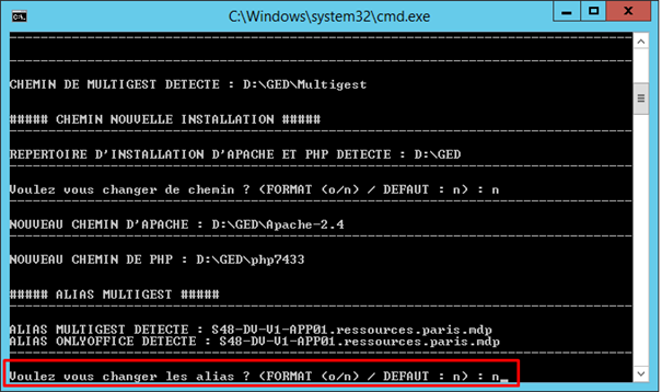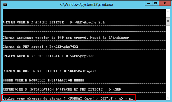 - L’installation retrouve le chemin où se trouve déjà Apache et PHP installés. Tapez la lettre « n » pour ne pas changer le chemin d’installation du package Apache et PHP car vous être en mode de mise à jour.