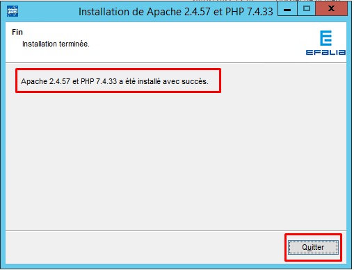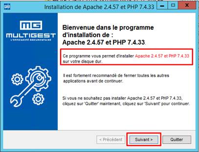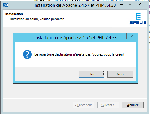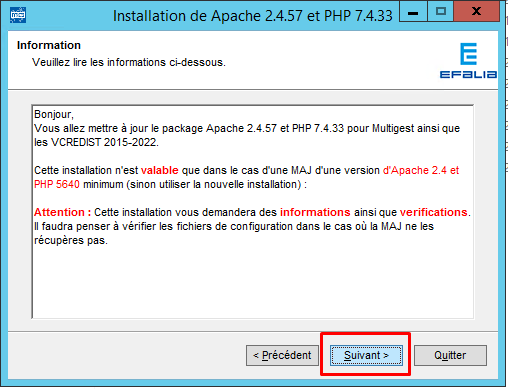 - La mise à jour du serveur Apache et PHP s’exécute à partir du package d’installation fourni par Efalia. Le contenu de ce package peut varier selon la version de Multigest. Le package est livré sous la forme d’un exécutable.