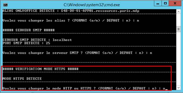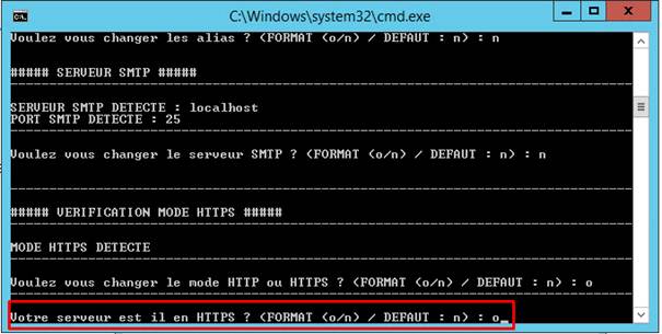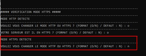 - Même procédure pour la vérification du HTTP(S). Si un certificat SSL était déjà installé, il sera détecté. Dans le cas contraire, une question vous sera posée si vous voulez changer le mode en HTTP ou HTTPS.