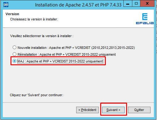 - Suivre les instructions et sélectionner l’option : « MAJ : Apache et PHP + VCREDIST 2015-2022 uniquement », puis cliquer le bouton « Suivant ».