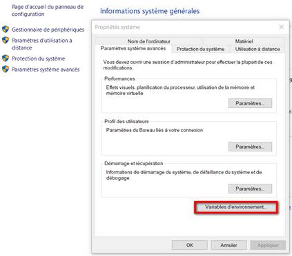 - Choisir « Paramètres Système avancées » puis « variables d’environnement ».