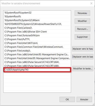 - Sélectionner la variable « PATH » et ajouter la valeur du chemin de PHP.