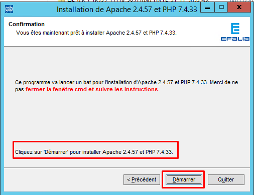 - Cliquer sur le bouton « Démarrer » pour installer Apache et PHP.