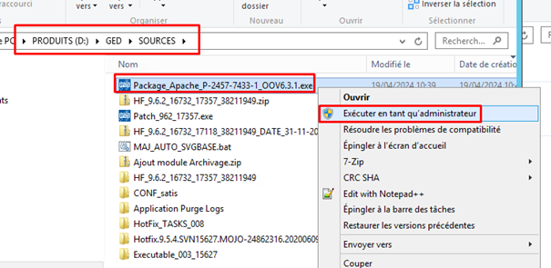 - Exécuter l’exécutable Package_Apache_P-24xx-7433-x_OOVx.x.x.exe en tant qu’administrateur.