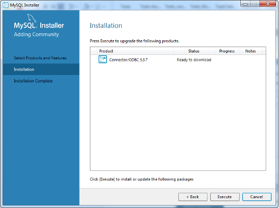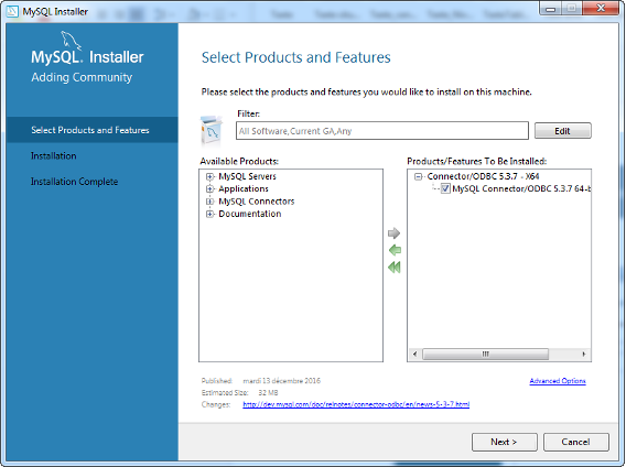 L’installation du pilote ODBC se réalise en utilisant l’installeur MySQL utilisé précédemment lors de l’installation de la base MySQL 5.7 (cf. Installation MySQL 5.7).