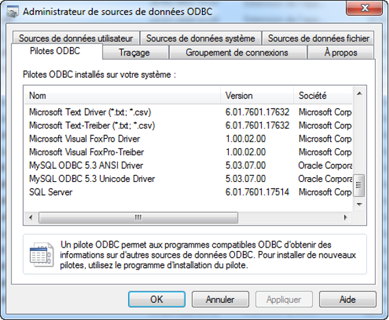 Vérifier que le pilote odbc : « MySQL ODBC 5.3 ANSI Driver » est présent.