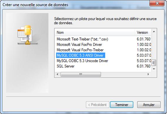Sélectionner le pilote « MySQL ODBC 5.3 ANSI Driver ».