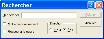 Elle vous permet de saisir dans le champ Rechercher, la chaîne de caractères recherchée. Vous pourrez également indiquer le sens dans lequel doit s’effectuer la recherche (vers le Haut ou vers le Bas – valeur par défaut).