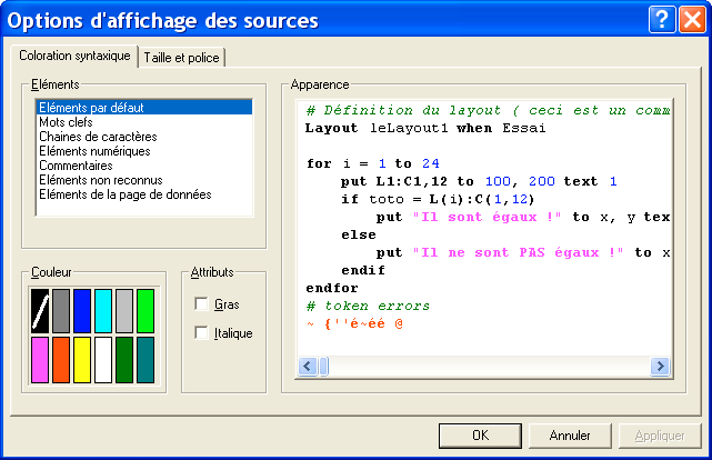 L’onglet Coloration syntaxique vous permet d’affecter aux divers éléments constitutifs de votre source, les couleurs et attributs de police qui vous semblent les plus pertinents.