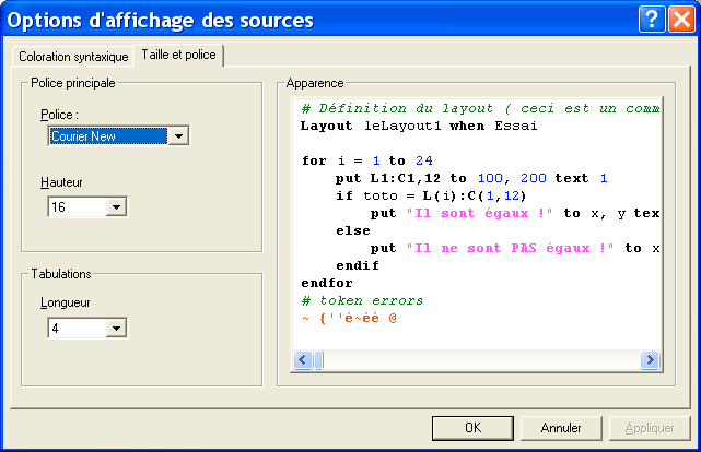 Vous pouvez y sélectionner la Police utilisée, la Hauteur de celle-ci et définir le nombre de blancs à utiliser pour représenter une tabulation (champ Tabulations).