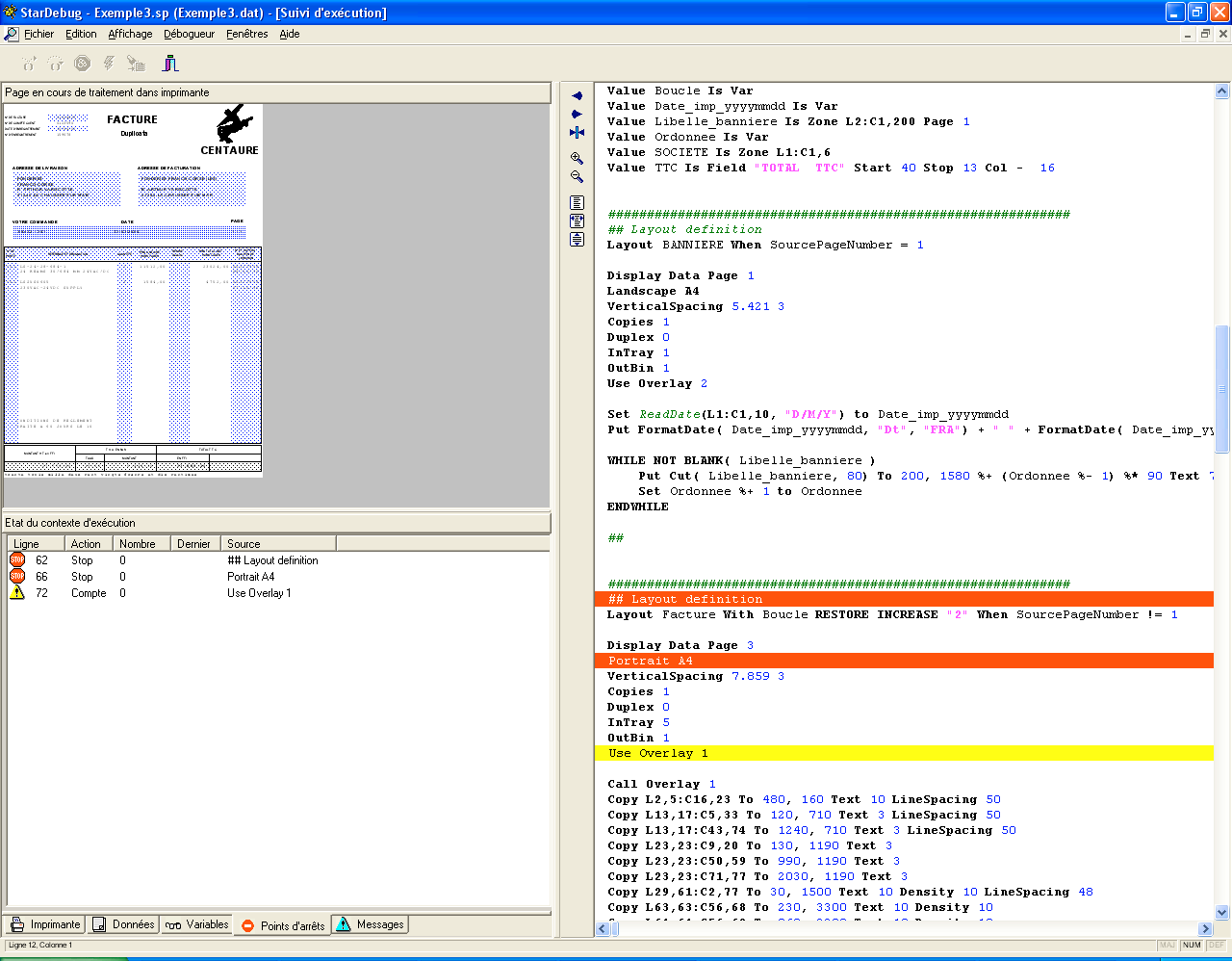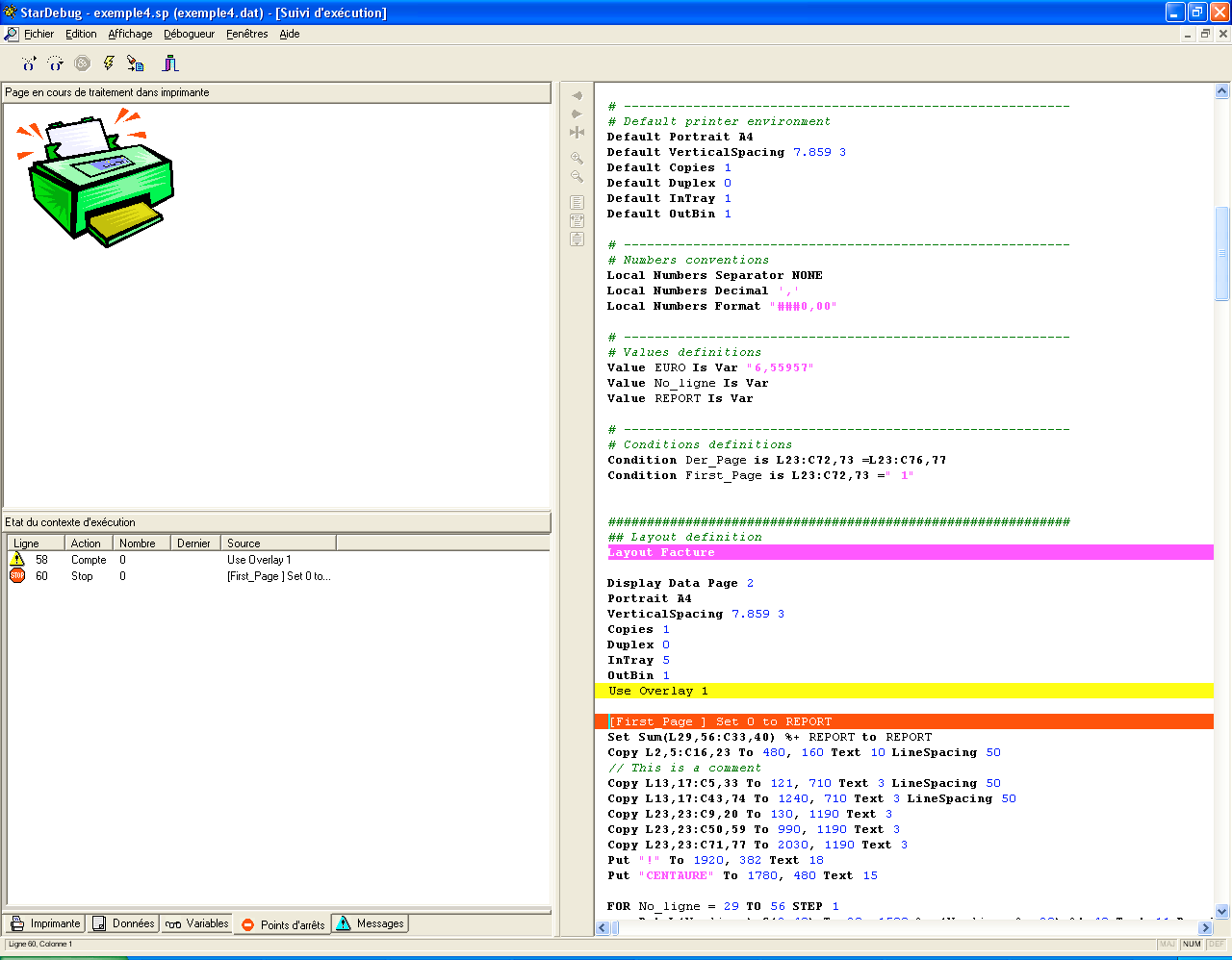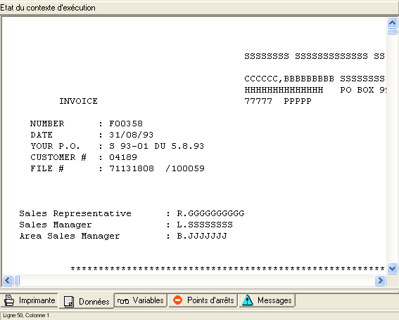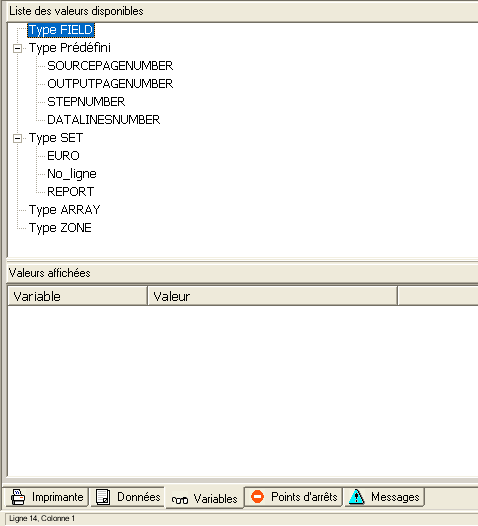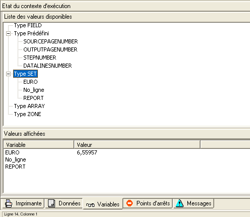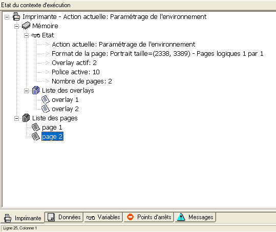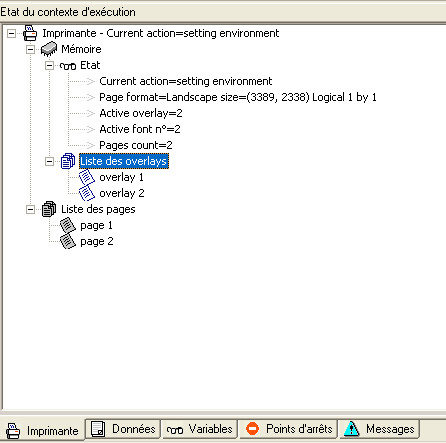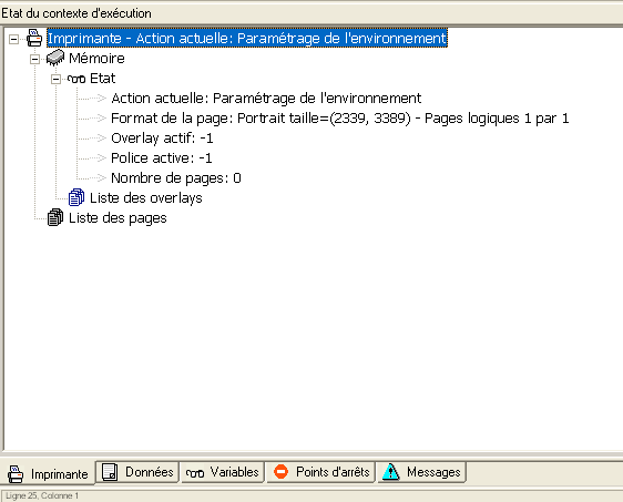 La fenêtre située en bas à gauche intitulée Etat du contexte d’exécution vous donne accès, au travers d’onglets sur lesquels vous pouvez cliquer à tout moment, à des informations concernant l’imprimante, les données, les variables, les points d’arrêt et les messages éventuels.