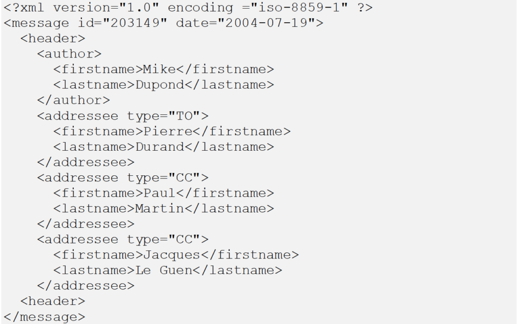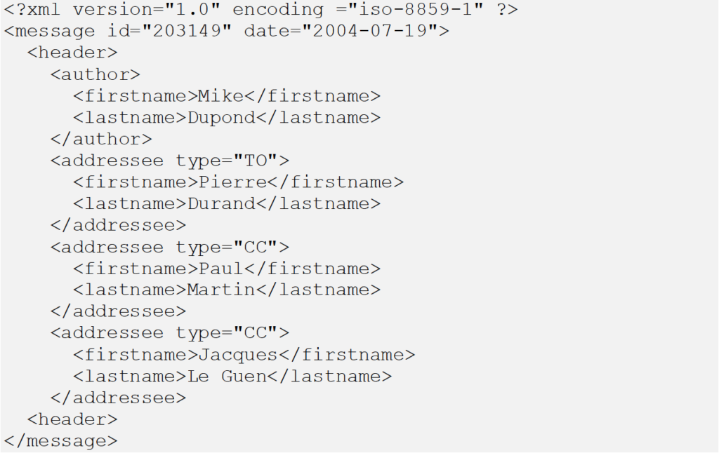 Dans un message électronique, le numéro d’identifiant du message <message id>, la date du message <message date>, et l’auteur <author> sont uniques. Ils peuvent donc être définis en tant que champ simple.