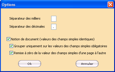 Cliquer sur le bouton Document… dans la section Données affiche la boîte de dialogue Options permettant de définir les délimiteurs utilisés pour les conversions de nombres, ainsi que la méthode de regroupement des pages en documents.