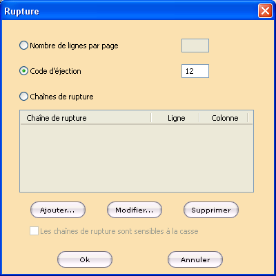 - Si chaque page commence par une chaîne de caractères, cocher le bouton Chaîne de rupture puis, cliquer sur Ajouter pour afficher la boîte de dialogue Chaîne de rupture.