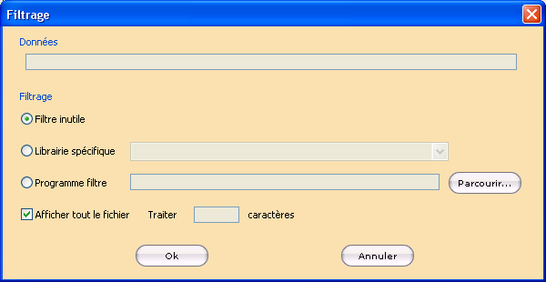 Cliquer sur le bouton Filtrage dans la section Données affiche la boîte de dialogue Filtrage permettant de sélectionner un filtre permettant, si nécessaire, de décoder les fichiers.