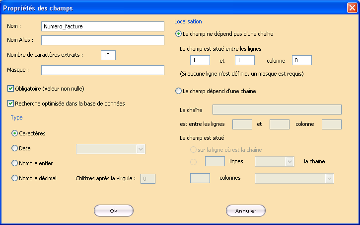 Cocher le bouton Obligatoire (Valeur non nulle) aboutit à ce que ce champ soit obligatoirement dans la page pour que le document soit archivé (par exemple, le numéro de client dans le cas d’une archive Facture). Si le champ est facultatif, StarSafe archive le document même si ce champ n’est pas renseigné.