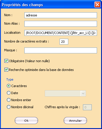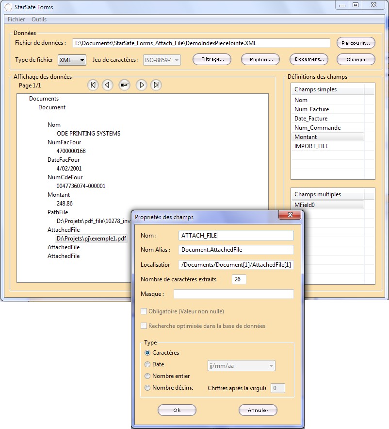 Cliquer avec le bouton droit de la souris sur un champ d’indexation donne accès à un menu contextuel permettant de supprimer ce champ, de modifier sa position dans la liste des champs à l’aide des options Monter ou Descendre ou, d’en afficher les propriétés – comme après un double clic – via une boîte de dialogue Propriétés des champs quelque peu différente selon le type de fichier de données SPL, XML ou PDF.