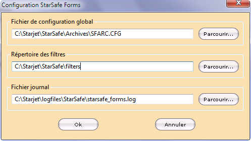 Cliquer sur l’option Paramètres du menu Outils affiche la boîte de dialogue Configuration StarSafe Forms permettant de sélectionner, à l’aide du bouton Parcourir, le fichier de configuration global .cfg, le répertoire des filtres ainsi que le fichier .log, fichier texte comprenant les messages d’erreur générés par l’application, informations indispensables à analyser en cas d’erreur.