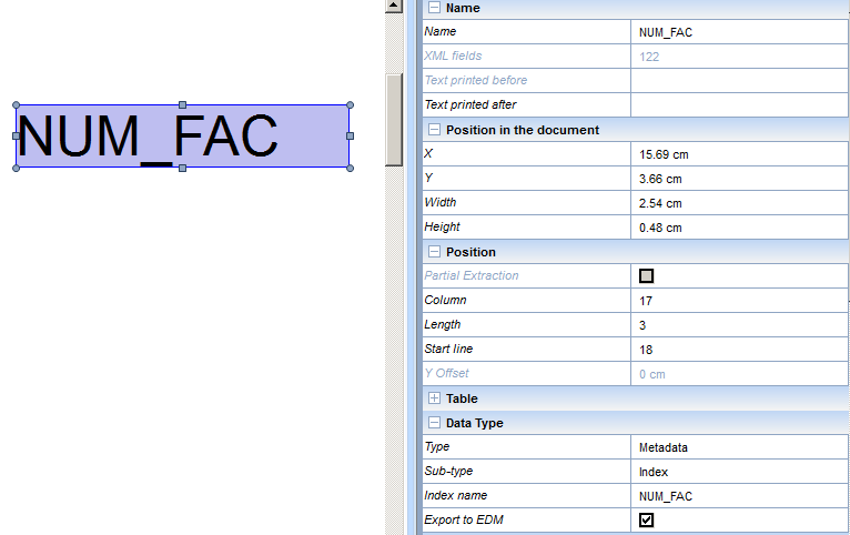 Dans cet exemple, la zone NUM_FAC sera exportée dans le fichier XML. Elle est définie comme suit :