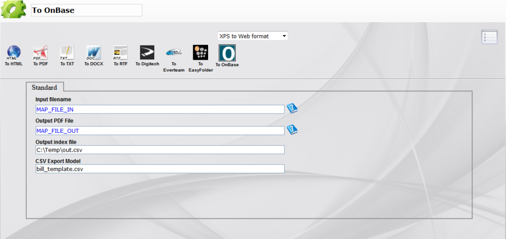 L’appel au connecteur OnBase est placé dans la section ‘XPS to Web Format’ :